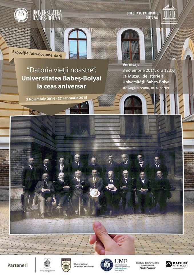 Muzeul de Istorie al Universităţii Babeş-Bolyai organizează luni, 3 noiembrie 2014, de la ora 12, vernisajul expoziţiei foto-documentare „Datoria vieţii noastre”: Universitatea Babeş-Bolyai la ceas aniversar, eveniment organizat cu ocazia împlinirii a 95 de ani de la susţinerea, de către Vasile Pârvan, a cursului inaugural al Universităţii „Daciei Superioare”, moment de început al învăţământului superior cu predare în limba română.