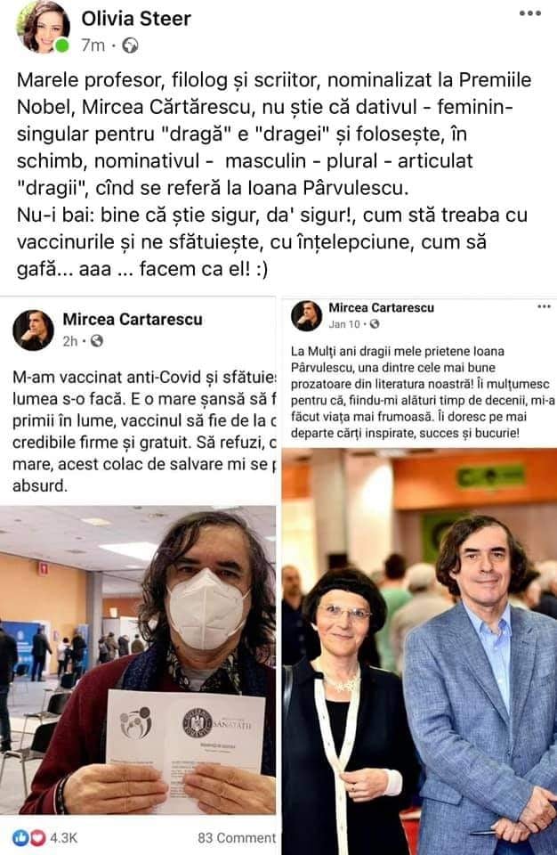 Controversata Olivia Steer, fostă prezentatoare tv, antivaccinistă, l-a atacat pe facebook pe scriitorul Mircea Cărtărescu reproșându-i pe un ton vehement că nu știe limba română. Scriitorul a replicat.
