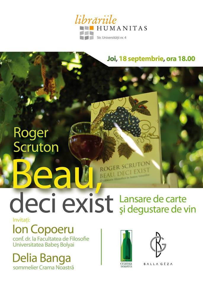Librăria Humanitas Cluj (Str. Universității, nr. 4) organizează joi, 18 septembrie, ora 18:00, lansarea cărții „Beau, deci exist”, de Roger Scruton. Despre carte va vorbi conf. dr. Ion Copoeru, Facultatea de Filosofie, Universitatea Babeș-Bolyai, iar despre lumea vinului, sommelier Crama Noastră, Delia Banga. La final vom degusta un pahar de vin selecționat de Balla Geza- Wine Princess, din podgoria Miniș-Arad. (www.wineprincess.ro)