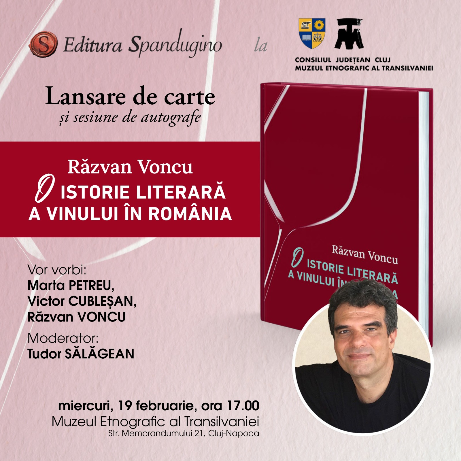 Muzeul Etnografic al Transilvaniei are deosebita plăcere să vă invite miercuri, 19 februarie, ora 17.00, la lansarea volumului O istorie literară a vinului în România de RĂZVAN VONCU, ediție revăzută și amplu adăugită, publicată de Editura Spandugino.