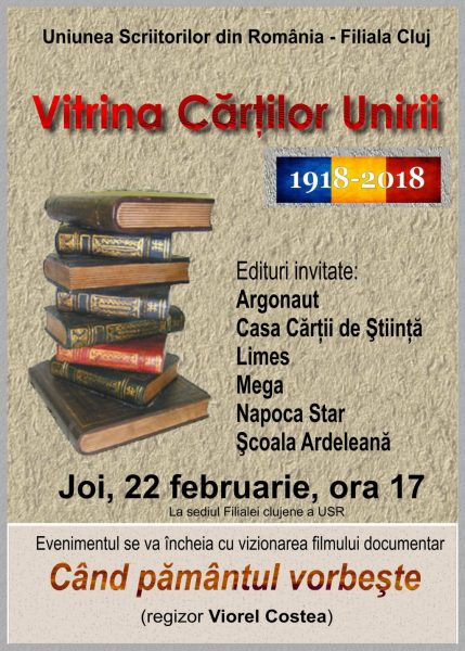 Filiala Cluj a Uniunii Scriitorilor vă invită la un eveniment dedicat Centenarului Unirii intitulat Vitrina Cărţilor Unirii.