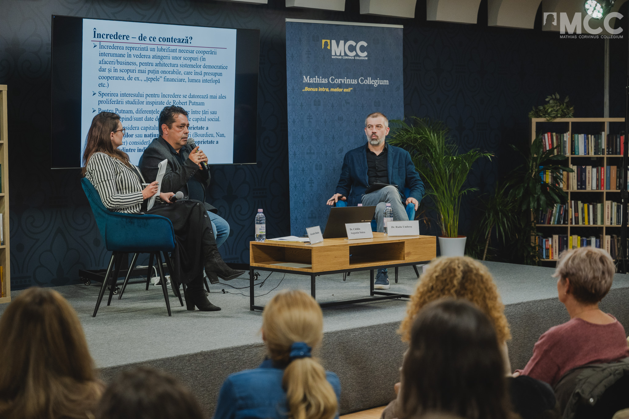 La începutul lunii noiembrie, Centrul MCC din Cluj a găzduit o nouă ediție a seriei Transylvania Lectures, având ca temă „Cultura neîncrederii – identitate colectivă în România?”. Evenimentul i-a adus în fața publicului pe dr. Radu Umbreș, antropolog la SNSPA, și pe dr. Cătălin Augustin Stoica, sociolog și profesor universitar la SNSPA, într-un dialog moderat de Alexandra Damian, expert în comunicare și manager de proiect al Mathias Corvinus Collegium.
