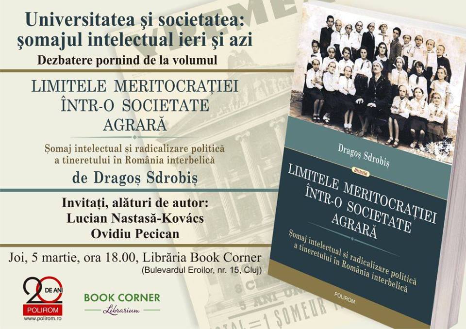 Librăria Book Corner organizează astăzi, 5 martie, de la ora 18.00, dezbaterea „Limitele meritocraţiei într-o societate agrară de Dragoş Sdrobiş pe marginea volumului „Limitele meritocraţiei într-o societate agrară. Şomaj intelectual şi radicalizare politică a tineretului în România interbelică”.