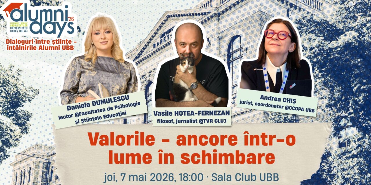 În cadrul „Alumni Days” din cadrul Universității Babeș-Bolyai (UBB), are loc cel de-al doilea dialog din seria „Dialoguri între științe – Întâlnirile Alumni UBB”, un eveniment despre oameni, apartenență și legăturile care contează. Evenimentul are loc joi, 7 mai, de la ora 18.00, la Sala Club a Universității Babeș-Bolyai, str. E. de Martonne nr. 1.