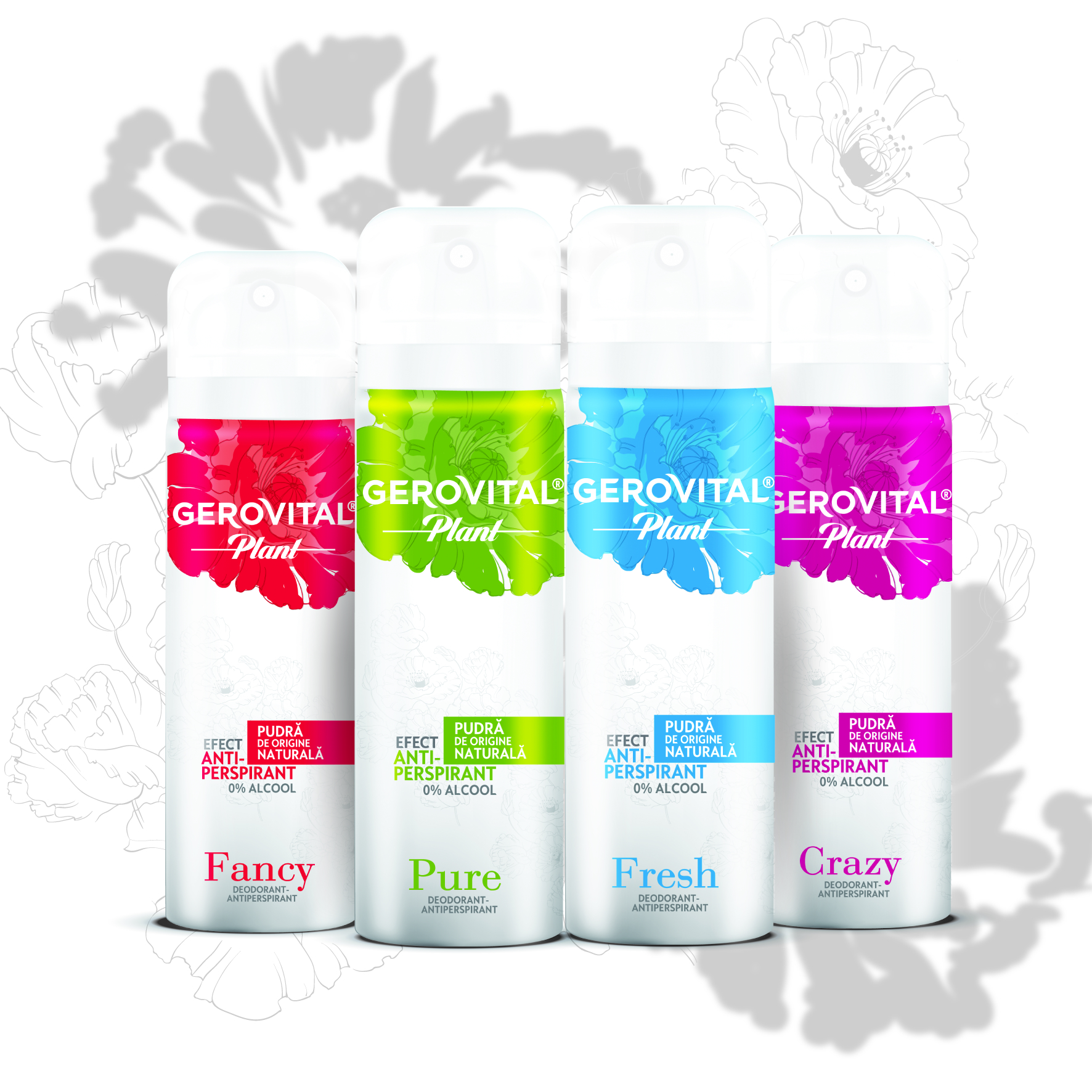 Linia de Deodorante Gerovital Plant este disponibilă în patru sortimente: Fresh, Crazy, Fancy şi Pure, toate cu note de parfum proaspete şi delicate. Acestea catifelează pielea, asigură o protecţie eficientă împotriva transpiraţiei, dar şi o senzaţie de prospeţime şi energie de durată.