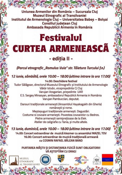 Muzeul Etnografic al Transilvaniei în colaborare cu Uniunea Armenilor din România – Sucursala Cluj, Institutul de Armenologie Cluj (UBB) și Ambasada Republicii Armenia în România vă invită în perioada 12-13 iunie 2021, la Festivalul Curtea Armenească, ediția a II-a. Evenimentul va avea loc în Parcul Etnografic Național „Romulus Vuia” (str. Tăietura Turcului), între orele 10-18, ultima intrare ora 17.