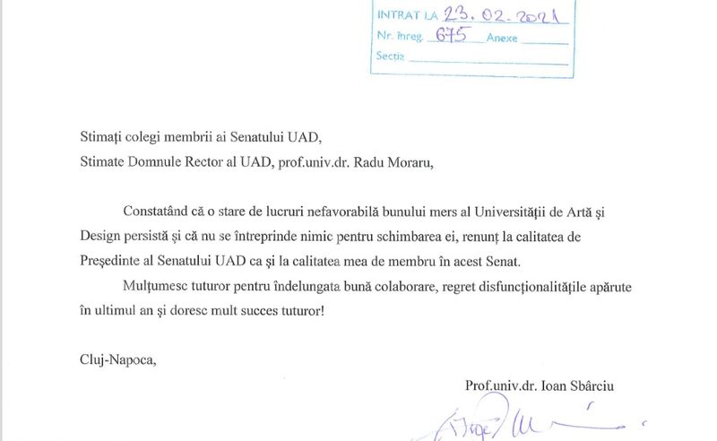 Președintele Senatului Universității de Artă și Design (UAD) Ioan Sbârciu, 73 de ani, şi-a depus astăzi demisia din funcţia de preşedinte a Senatului dar și ca membru al acestuia.