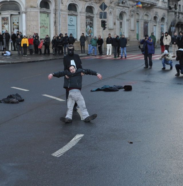 Ieri a fost o vreme rece, frig, lapoviţă, vânt puternic când o mână de studenţi de la teatru conduşi de designerul Ciprian Butnaru, de la lunarul clujean Sinteza, iniţiatorul performance-ului, au reconstituit excepţional modul în care Armata a tras în popor, în manifestanţii anticomunişti de la Cluj-Napoca.