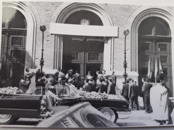 Ceaușescu ajunge la sediul central al Universității ”Babeș-Bolyai” împreună cu soția sa, Elena. Fotografie de  Ludovic-Filip Hrdlicska