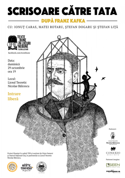 Franz Kafka – Scrisoare către tata. Spectacol de teatru – lectură va avea loc duminică, 29 octombrie, la Liceul Nicolae Bălcescu, ora 19.00.