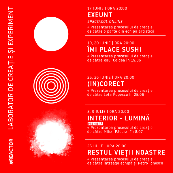 În lunile iunie-iulie, Reactor se adâncește în diferite căutări artistice și deschide ușile laboratoarelor care au stat la baza unora dintre spectacolele create aici.