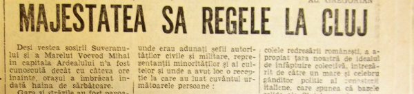De la gară, unde M.S. Regele, Marele Voievod Mihai au fost primiţi de d. Al. Vaida Voevod, consilier regal, d. Al. Radian, ministrul propagandei, d. Tr. Pop, ministrul inventarului avuţiilor publice, d. Coriolan Tătaru, rezident regal al ţinutului Someş, d. general inspector de armată G. Florescu, de reprezentanţii autorităţilor şi de primarul Clujului, d. Sebastian Bornemisa, care a oferit tradiţionala pâine şi sare, s-a format un cortegiu de automobile, care în uralele nesfârşite ale mulţimei a străbătut Calea Regele Ferdinand, Piaţa Unirii, strada Memorandumului până la Cercul Militar, unde erau adunaţi şefii autorităţilor civile şi militare, reprezentanţii minorităţilor şi ai cultelor şi unde a avut loc o recepţie”, informa cotidianul citat.