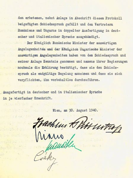 Deşi conducerea celui de-al III-lea Reich a sperat că arbitrajul din 30 august 1940 va contribui la dezamorsarea situaţiei tensionate şi relansarea colaborării economice şi politice dintre Bucureşti şi Budapesta , evoluţia ulterioară a raporturilor româno-maghiare a infirmat categoric aceste speranţe. În perioada 30 august 1940-23 august 1944, relaţiile dintre România şi Ungaria nu numai că nu s-au îmbunătăţit, ci, dimpotrivă, s-au deteriorat rapid şi ireversibil. În acest interval de timp raporturile dintre cele două state vecine pot fi caracterizate prin existenţa unui război rece, care, nu de puţine ori a fost pe punctul de a se transforma într-unul cald . În consecinţă, raporturile dintre România şi Ungaria în intervalul de timp amintit au stat sub semnul consecinţelor (politice, economice, sociale etc.) nefaste ale sentinţei arbitrale din Viena, respectiv sub semnul competiţiei acerbe declanşate între cele două state în scopul obţinerii „bunăvoinţei” Germaniei în vederea soluţionării definitive a chestiunii Transilvaniei. Pe de altă parte, cel de-al doilea arbitraj de la Viena a avut repercusiuni majore inclusiv asupra situaţiei interne din România, respectiv în privinţa evoluţiei relaţiilor dintre Bucureşti şi Berlin.”