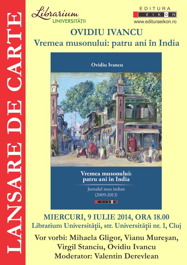 Editura Eikon organizează miercuri, 9 iulie 2014, începând cu ora 18.00, la Librarium Universității (Str. Universității nr. 1, Cluj-Napoca), lansarea de carte „Vremea musonului: patru ani în India. Jurnalul meu indian (2009-2013)”, scrisă de Ovidiu Ivancu.