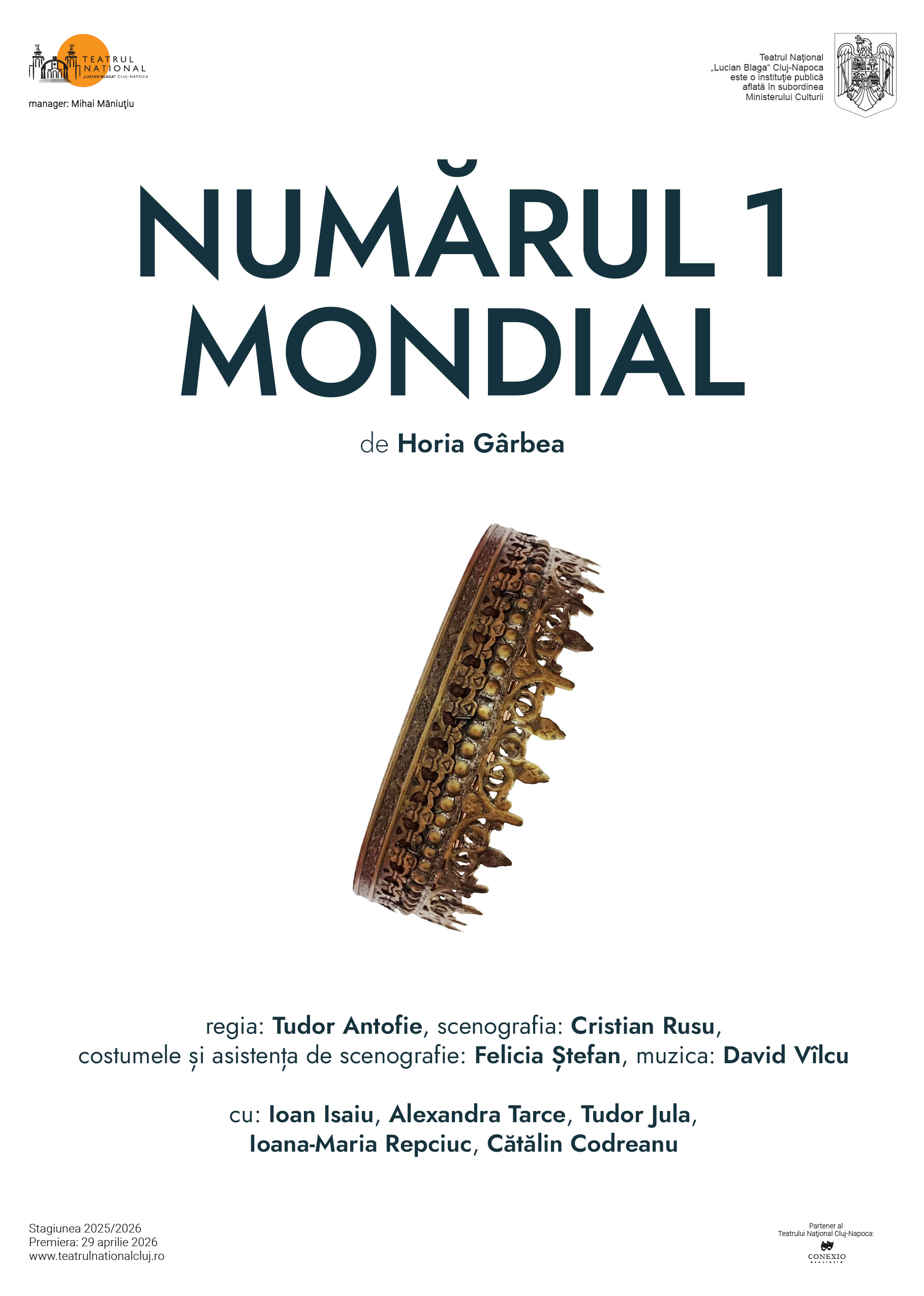 Teatrul Național „Lucian Blaga” din Cluj-Napoca vă invită miercuri, 29 aprilie, de la ora 19:00, în Studioul Euphorion, la premiera Numărul 1 mondial de Horia Gârbea, în regia lui Tudor Antofie, un spectacol care oglindește realitatea distorsionată a celor ce conduc lumea, adesea inconștienți de existența propriilor limite.