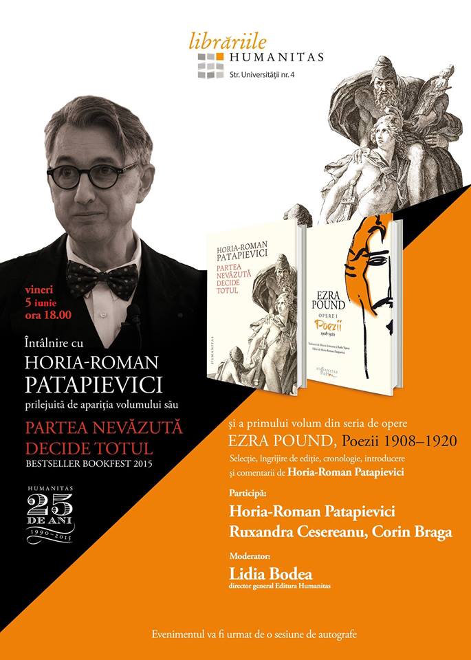 Vineri, 5 iunie, de la ora 18.00 eseistul Horia-Roman Patapievici propune o dublă lansare de carte și o sesiune de autografe! El va lansa ultimul său volum „Partea nevăzută decide totul”, bestseller Bookfest 2015 si un volum de poezii Ezra Pound.