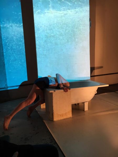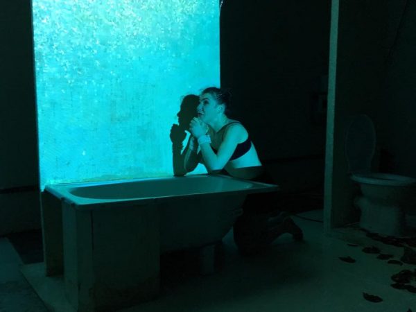 Decorurile gândute de Grosu  au fost minimaliste. Pe fondul unei lumini difuze, care adâncește depresia, totul se petrece în toaleta personajului, un wc și o cadă cu apă caldă fiind toată recuzita. Plus un pachet de țigări și niște frunze. Din off se aude, din când în când,  dialogul dintre personajul principal și posibilul doctor. Alexandra Cheroiu face un rol  dificil, care cere multă concentrare, atât la text, unul profund, dur pe alocuri, cât și la joc în sine. E udă pe tot corpul, se dezbracă complet, se urcă pe wc, cade în vană, dialoghează cu eul ei, cu divinitatea, înjură, suferă incredibil. Un rol care nu poate lăsa spectatorul indiferent, mai ales că aceste e la un metru de scena unde actrița interpretează. Suferința, mimica, respirația, goliciunea, totul se vede perfect, se transmite către spectatori. Emoția se vede și pe chipurile lor. Încearcă să înțeleaga prin ce trece personajul, mai ales că în viața reală depresia e atât de prezentă…