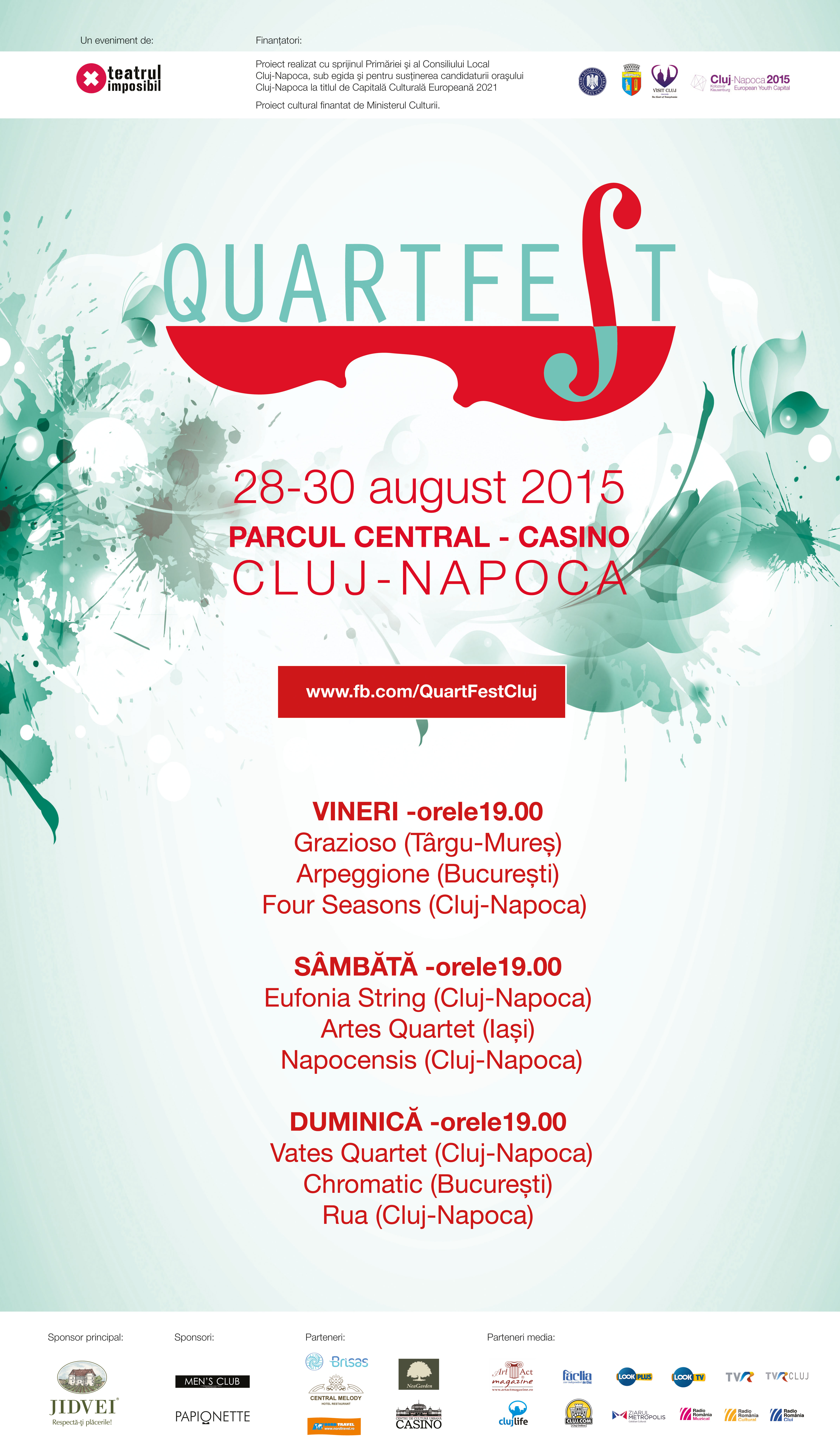 Festivalul QuartFest, dedicat cvartetelor de coarde din România, își așteaptă spectatorii pasionați de muzică clasică, jazz şi coveruri în Cluj-Napoca, în perioada 28-30 august 2015.