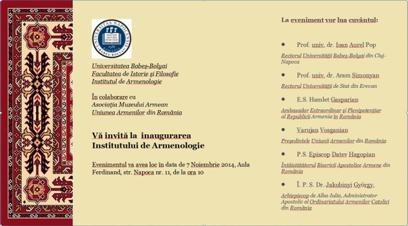 Primul Institut de Armenologie de pe lângă Universitatea Babeş-Bolyai va fi deschis oficial vineri, 7 noiembrie 2014, la ora 10, in Aula “Regele Ferdinand I” a UBB, anunţă profesorul Lucian Nastasă Kovacs, membru al Institutului.