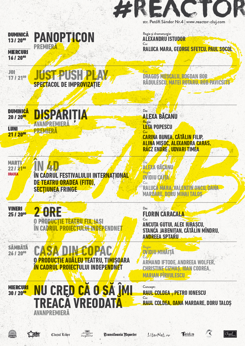 După deplasări în Iași, Bacău, Mamaia, Roșia Montană și Bonțida, după finalizarea cu succes a proiectelor Vacanța Animată MiniReactor și Școala de Vară, actorii de la Reactor se pregătesc cu proiecte noi, care să confirme faptul că teatrul independent e o prezență necesară pe harta culturală a Clujului.