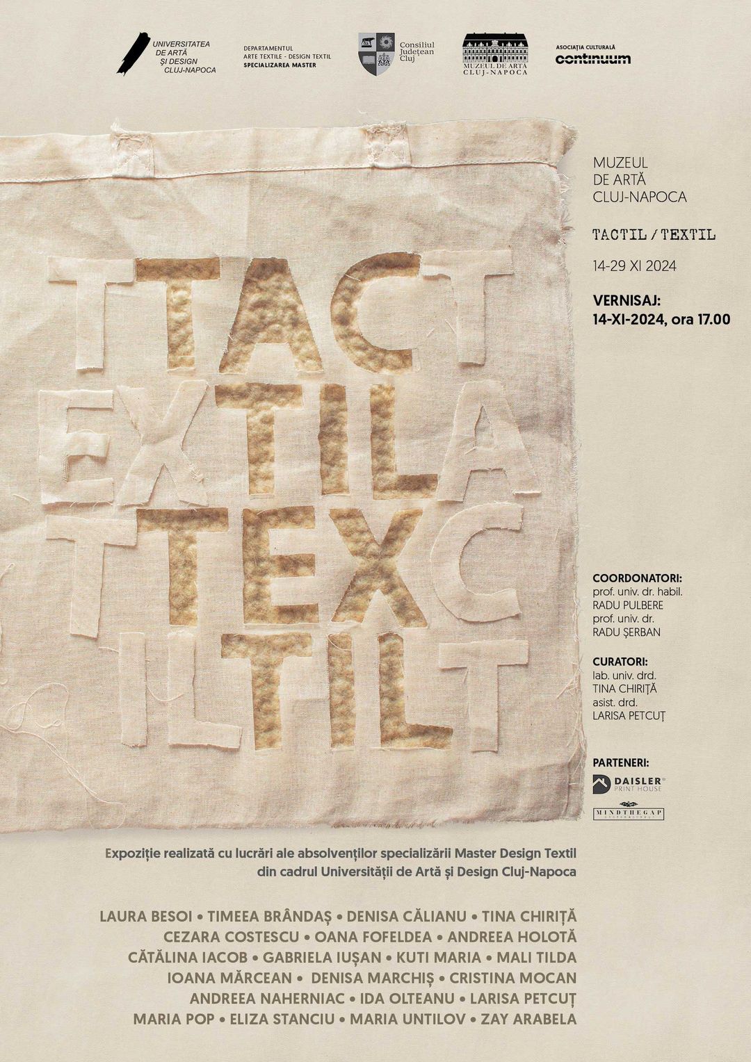 Muzeul de Artă Cluj-Napoca (MACN) organizează, în perioada 14-29 noiembrie 2024, expoziția de grup Tactil / Textil, un proiect coordonat de prof. univ dr. habil. Radu Pulbere și prof. univ. dr. Radu Șerban. Această expoziție este curatoriată de lect. univ. drd. Tina Chiriță și asist. drd. Larisa Petcuț și este realizată cu sprijinul Asociației Culturale Continuum, în parteneriat cu MINDTHEGAP din Târgu Mureș și Daisler Print House din Cluj-Napoca.