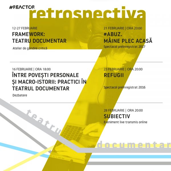 Programul începe în data de 16 februarie, ora 18.00, cu dezbaterea „Între povești personale și macro-istorii: practici în teatrul documentar”, la care vor participa artiști și artiste cu experiențe și abordări diverse în acest tip de teatru: Cristian Ban, Raul Coldea, Nicoleta Esinencu, Petro Ionescu, Adina Lazăr și David Schwartz. Discuția va fi moderată de teatroloaga Cristina Iancu și prezentată pe pagina de Youtube a Reactor.